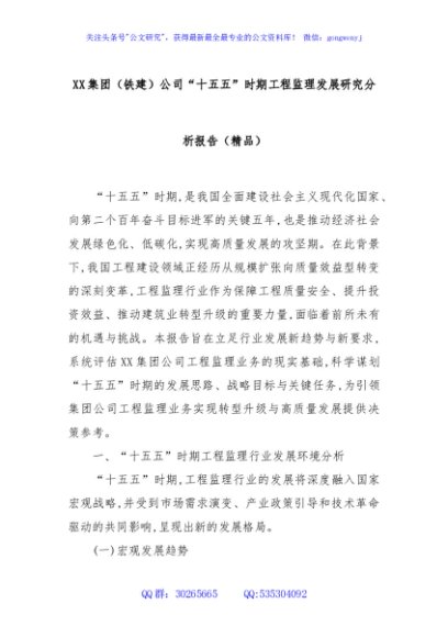 / XX集团(铁建)公司“十五五”时期工程监理发展研究分析报告(精品)