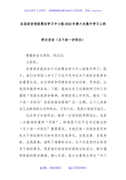 / 在县政协党组理论学习中心组2025年第六次集中学习上的研讨发言(五个进一步到位)