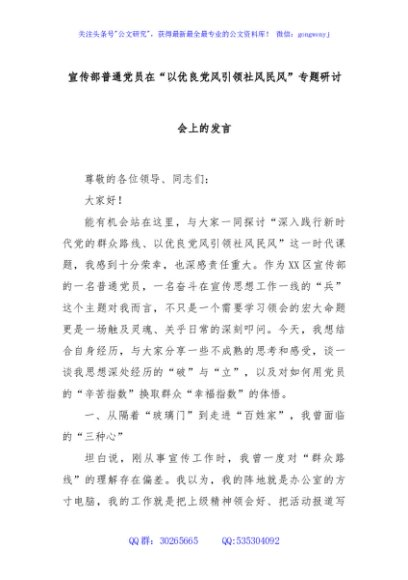 / 宣传部普通党员在“以优良党风引领社风民风”专题研讨会上的发言