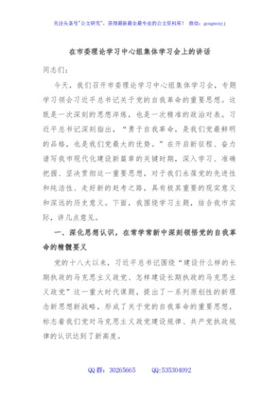 / 在市委理论学习中心组集体学习会上的讲话