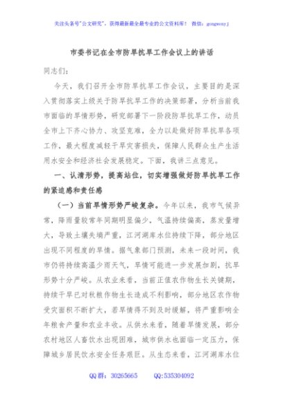 / 市委书记在全市防旱抗旱工作会议上的讲话