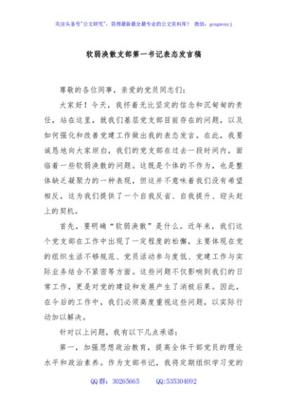 / 软弱涣散支部第一书记表态发言稿