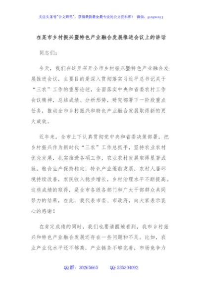 / 在某市乡村振兴暨特色产业融合发展推进会议上的讲话