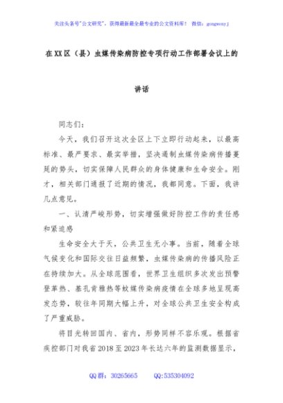 / 在XX区(县)虫媒传染病防控专项行动工作部署会议上的讲话
