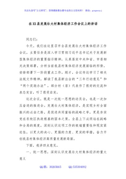 / 在XX县发展壮大村集体经济工作会议上的讲话