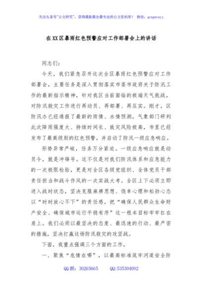 / 在XX区暴雨红色预警应对工作部署会上的讲话