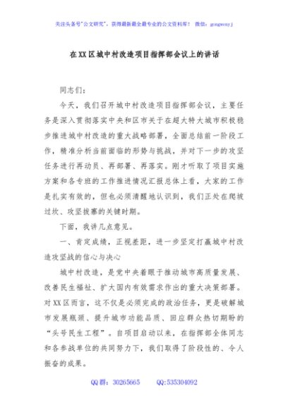 / 在XX区城中村改造项目指挥部会议上的讲话