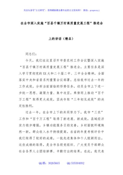 / 在全市深入实施“百县千镇万村高质量发展工程”推进会上的讲话(精品)