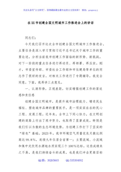 / 在XX市创建全国文明城市工作推进会上的讲话