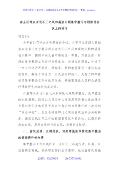 / 在全区群众身边不正之风和腐败问题集中整治专题推进会议上的讲话