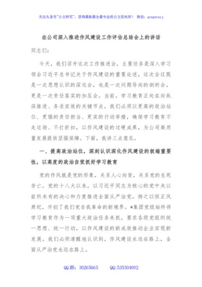 / 在公司深入推进作风建设工作评估总结会上的讲话