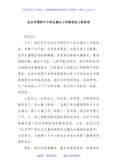 / 在全市预防中小学生溺水工作推进会上的讲话