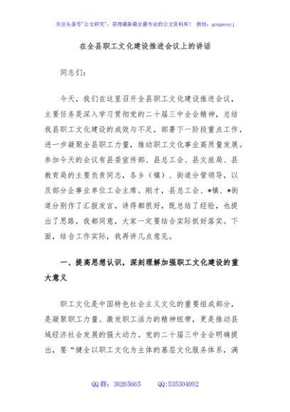 / 在全县职工文化建设推进会议上的讲话