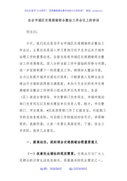/ 在全市城区交通拥堵综合整治工作会议上的讲话
