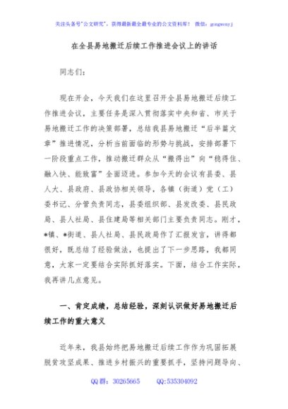 / 在全县易地搬迁后续工作推进会议上的讲话