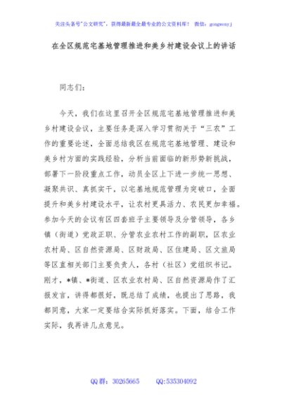 / 在全区规范宅基地管理推进和美乡村建设会议上的讲话