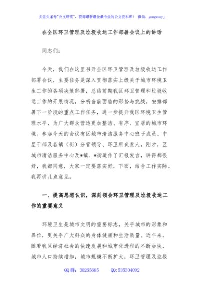 / 在全区环卫管理及垃圾收运工作部署会议上的讲话