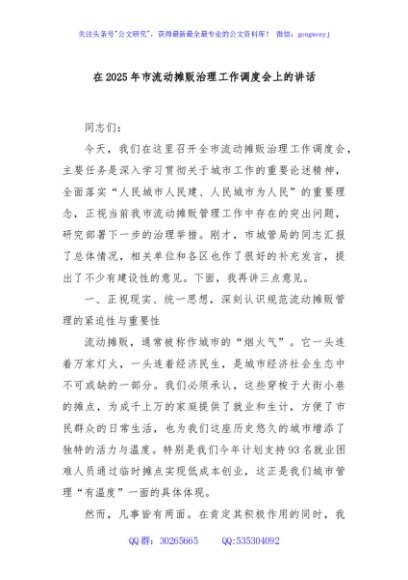 / 在2025年市流动摊贩治理工作调度会上的讲话