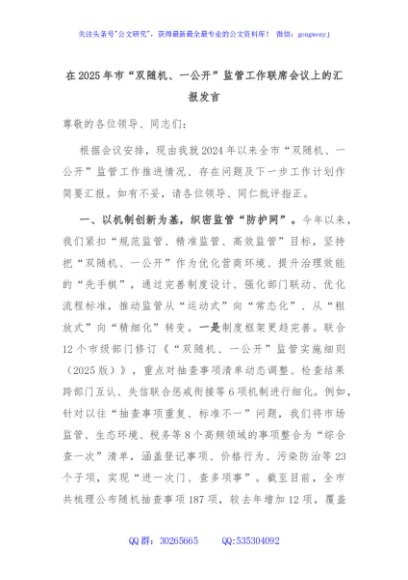 / 在2025年市“双随机、一公开”监管工作联席会议上的汇报发言
