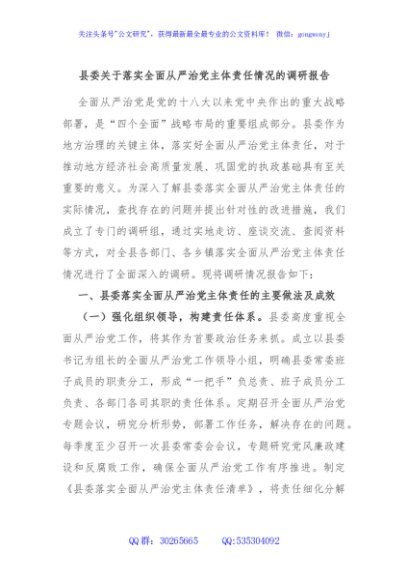 / 县委关于落实全面从严治党主体责任情况的调研报告