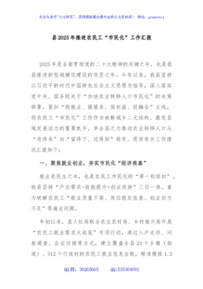 / 县2025年推进农民工“市民化”工作汇报