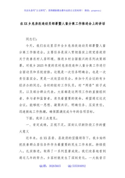 / 在XX乡危房改造动员部署暨人畜分离工作推进会上的讲话