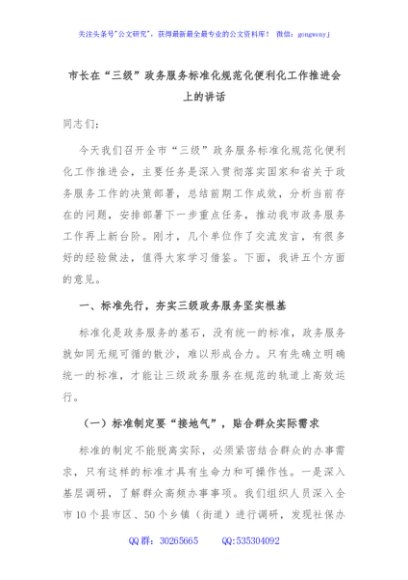 / 市长在“三级”政务服务标准化规范化便利化工作推进会上的讲话