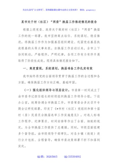 / 某市关于村(社区)“两委”换届工作推进情况的报告