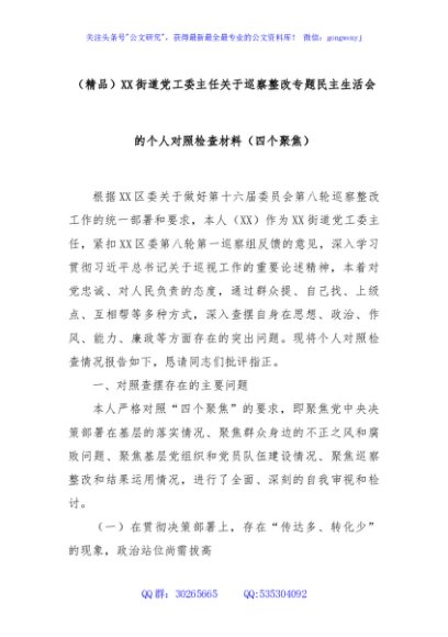 / (精品)XX街道党工委主任关于巡察整改专题民主生活会的个人对照检查材料(四个聚焦)