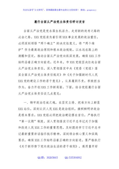 / 履行全面从严治党主体责任研讨发言