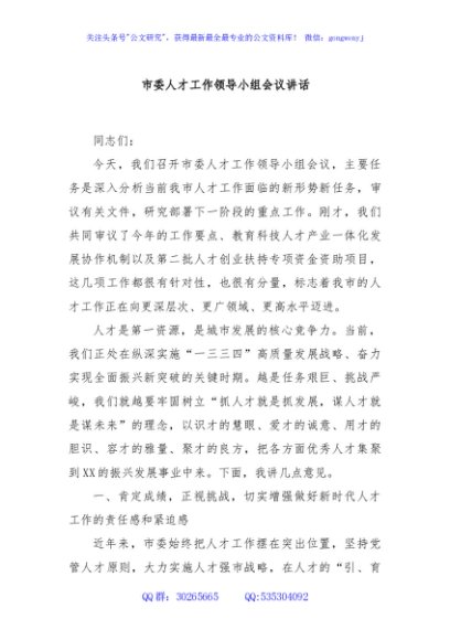 / 市委人才工作领导小组会议讲话