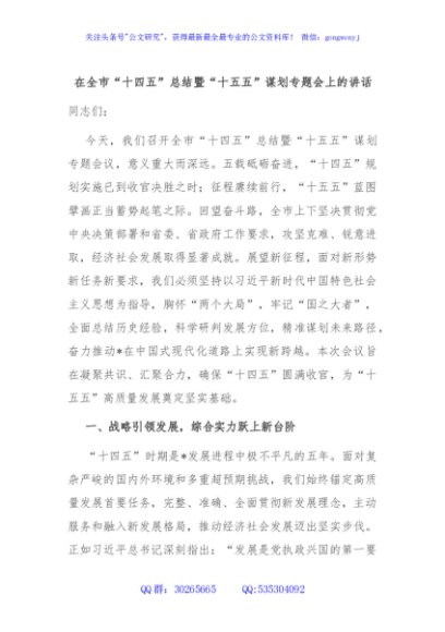 / 在全市“十四五”总结暨“十五五”谋划专题会上的讲话