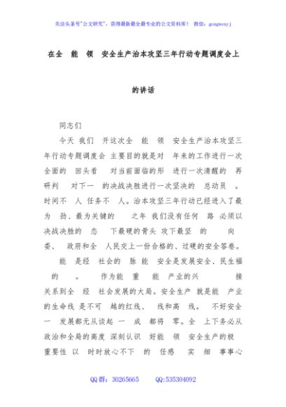 / 在全市能源领域安全生产治本攻坚三年行动专题调度会上的讲话