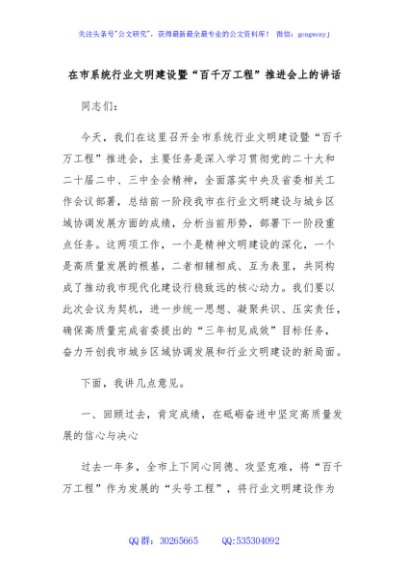 / 在市系统行业文明建设暨“百千万工程”推进会上的讲话