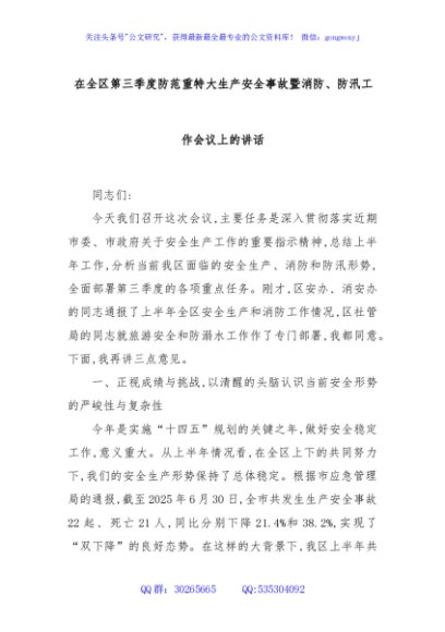 / 在全区第三季度防范重特大生产安全事故暨消防、防汛工作会议上的讲话