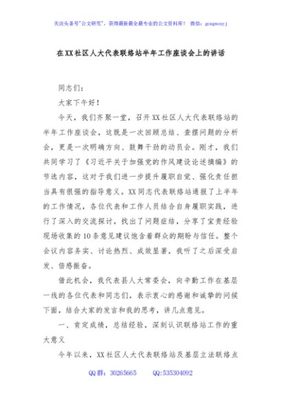 / 在XX社区人大代表联络站半年工作座谈会上的讲话