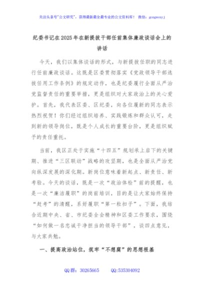 / 纪委书记在2025年在新提拔干部任前集体廉政谈话会上的讲话