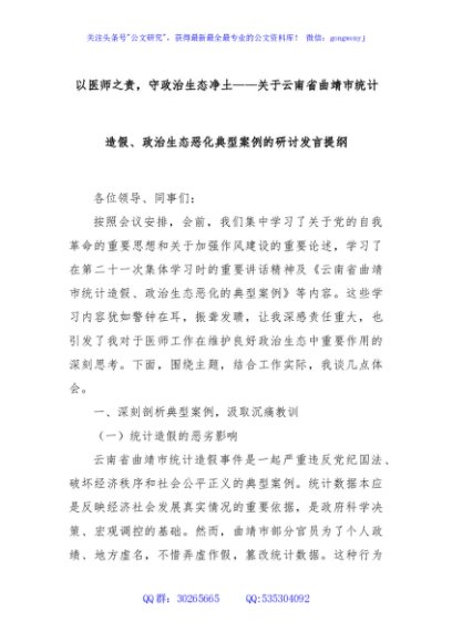 / 以医师之责,守政治生态净土——关于云南省曲靖市统计造假、政治生态恶化典型案例的研讨发言提纲