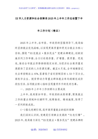 / XX市人力资源和社会保障局2025年上半年工作总结暨下半年工作计划(精品)
