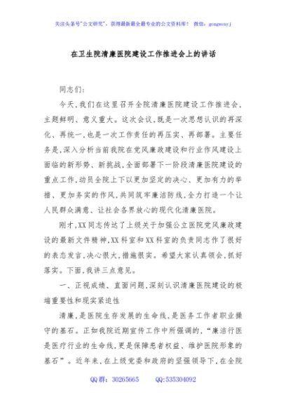 / 在卫生院清廉医院建设工作推进会上的讲话