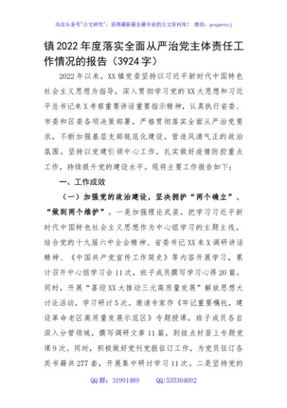 / 镇2022年度落实全面从严治党主体责任工作情况的报告
