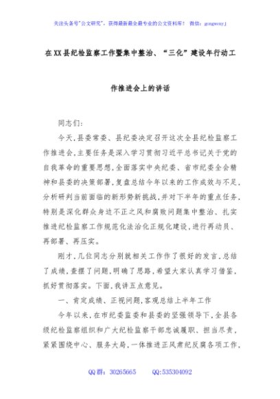 / 在XX县纪检监察工作暨集中整治、“三化”建设年行动工作推进会上的讲话