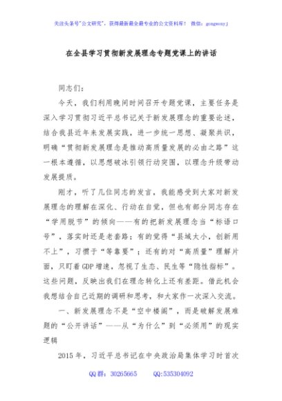 / 在全县学习贯彻新发展理念专题党课上的讲话