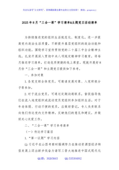 / 2025年8月“三会一课”学习清单&主题党日活动清单