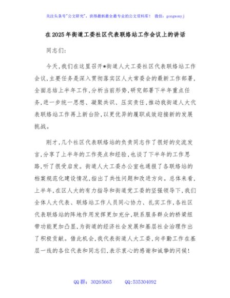 / 在2025年街道工委社区代表联络站工作会议上的讲话