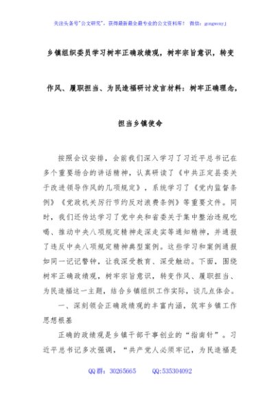 乡镇组织委员学习树牢正确政绩观,树牢宗旨意识,转变作风、履职担当、为民造福研讨发言材料:树牢正确理念,担当乡镇使命