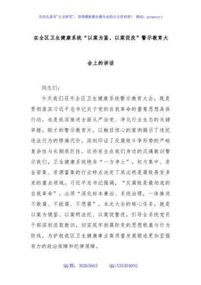 / 在全区卫生健康系统“以案为鉴、以案促改”警示教育大会上的讲话