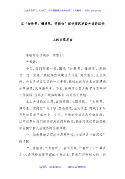 / 在“知敬畏、懂感恩、爱岗位”纪律作风建设大讨论活动上的交流发言