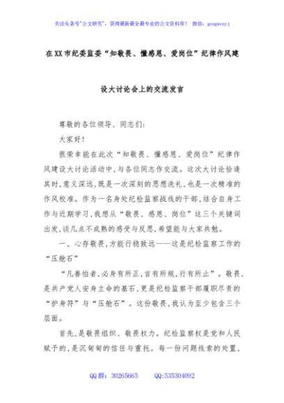 / 在XX市纪委监委“知敬畏、懂感恩、爱岗位”纪律作风建设大讨论会上的交流发言