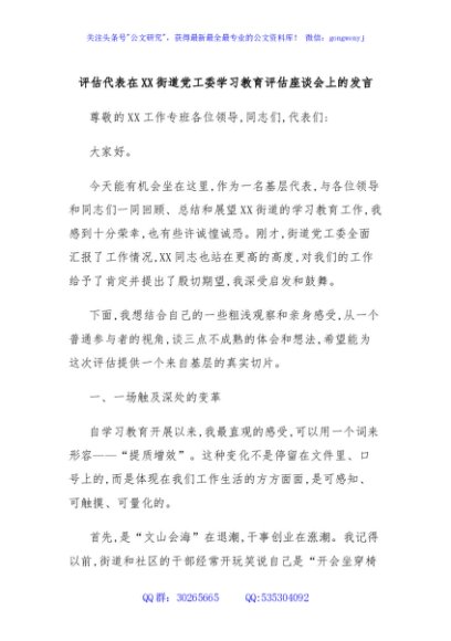 / 评估代表在XX街道党工委学习教育评估座谈会上的发言